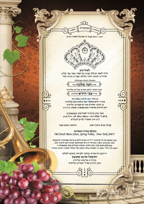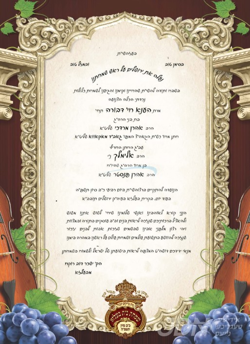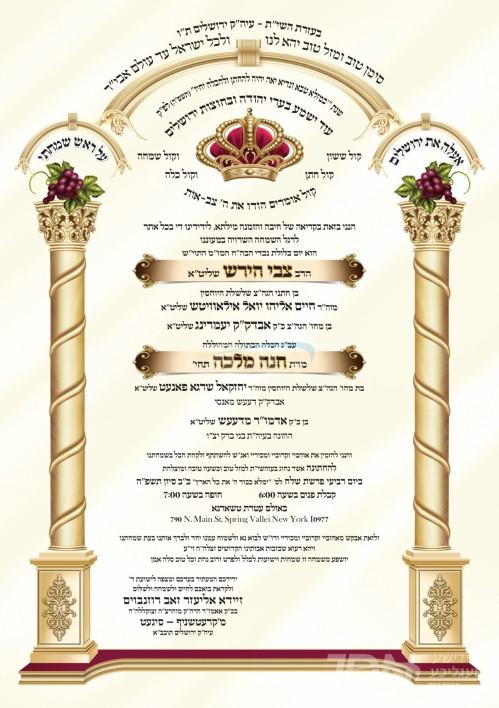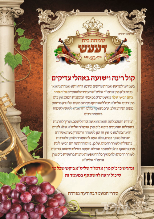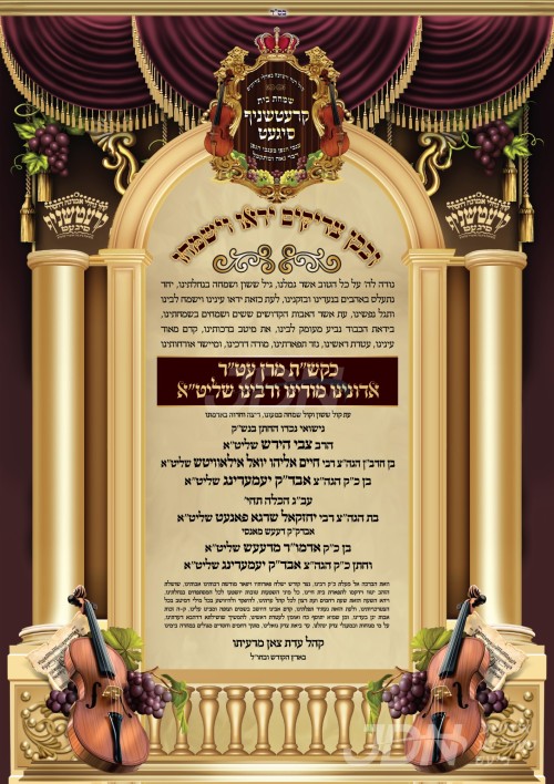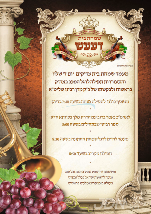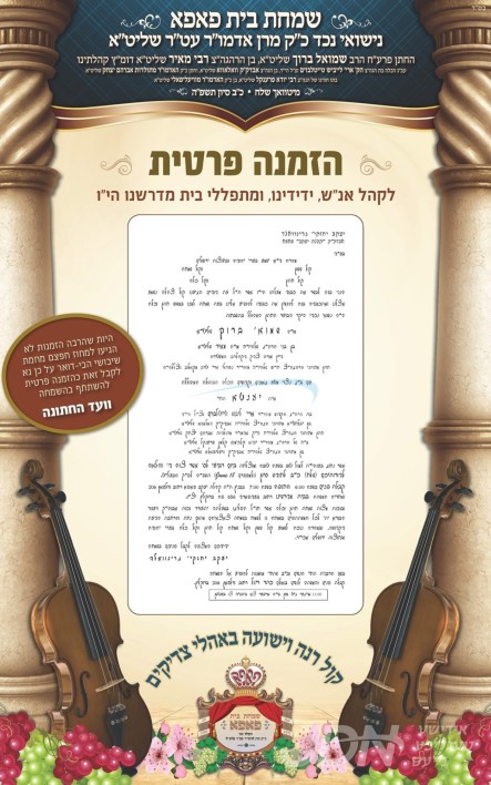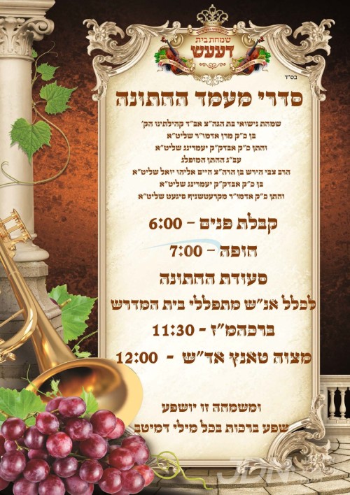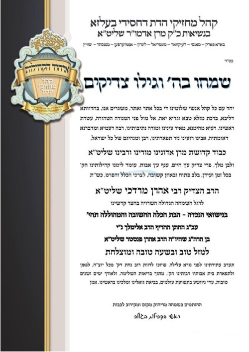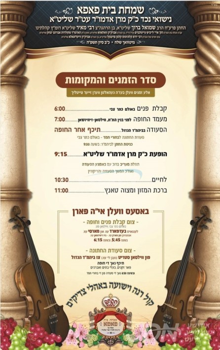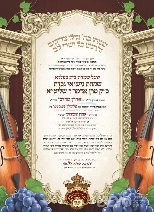 היינט קומט פאר די שמחת החתונה פונעם חתן א זון פון הגה"צ ר' אברהם כהנא שליט"א אדמו"ר מספינקא בית שמש, איידעם ביי כ"ק אדמו"ר מטעמעשוואר ירושלים זצ"ל, מיט די כלה א טאכטער פון הגה"צ ר' ארי' מרדכי ראבינאוויטש שליט"א, זון פון כ"ק אדמו"ר מקאלושין שליט"א, און איידעם ביי הגה"צ ר' יצחק טייטלבוים שליט"א מהוסאקוב. – די שמחת החתונה קומט פאר אין זאל הכרמים אין בית שמש.