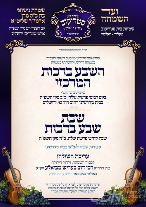 שמחת בית סטריקוב – מעליץ – האלמין: היינט קומט פאר די שמחת השבע ברכות פונעם חתן א זון פון הגה"צ ר' נחמן מאסקאוויטש שליט"א, זון פון כ"ק אדמו"ר ממעליץ שליט"א, און איידעם ביי כ"ק אדמו"ר מהאלמין שליט"א, מיט די כלה א טאכטער פון כ"ק אדמו"ר מסטריקוב ירושלים שליט"א, זון פון הגה"צ ר' משה שמואל שטערן שליט"א אבד"ק סטריקוב, און איידעם ביי הגה"צ ר' מנחם נחום טווערסקי זצ"ל מראחמיסטריווקא. – די שמחת השבע ברכות קומט פאר אין סטריקובער בית המדרש אויף רחוב דוד אין ירושלים.