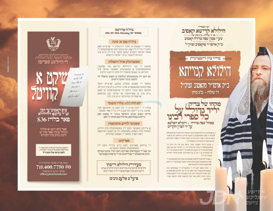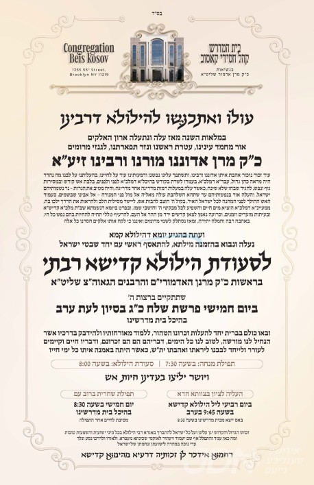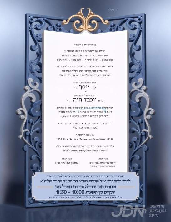 היינט קומט פאר די שמחת החתונה פונעם חתן א זון פון הגה"צ ר' מאיר שמואל שפיגל שליט"א אדמו"ר מקאלושין לאנדאן, זון פון כ"ק אדמו"ר מאסטראוו קאלושין זצ"ל, און איידעם ביי כ"ק אדמו"ר מסטאניסלאוו לאנדאן זצ"ל, מיט די כלה א טאכטער פון הרב אליעזר זוסיא וויינבערגער שליט"א, זון פון הגה"צ ר' שמעון יואל וויינבערגער שליט"א גאב"ד וויטקא, און איידעם ביי הגה"צ ר' יעקב ישראל ווייסמאנדל שליט"א, זון פון הגה"ק מנייטרא זצ"ל. – די שמחת החתונה קומט פאר אין זאל ויואל משה אין וויליאמסבורג.