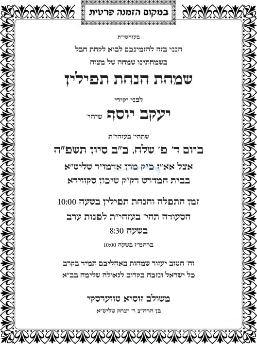 היינט קומט פאר די שמחת הנחת תפילין פון א אור אייניקל ביי כ"ק אדמו"ר מסקווירא שליט"א, אייניקל פון זיין זון הגה"צ ר' יצחק טווערסקי שליט"א, איידעם ביי כ"ק אדמו"ר מוויזניץ שליט"א, הבחור הבר מצוה יעקב יוסף א זון פון זיין זון הרב זושא טווערסקי שליט"א, אייניקל פון כ"ק אדמו"ר מליעזש ראדוואן שליט"א. – די שמחה קומט פאר אין ביהמ"ד הגדול אין שיכון סקווירא.