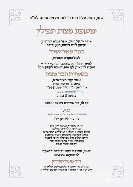 היינט קומט פאר די שמחת הבר מצוה פון א אייניקל ביי כ"ק אדמו"ר משענדישוב שליט"א, א זון פון זיין זון הרב דוד משה הורוויץ שליט"א, איידעם ביי כ"ק אדמו"ר משומרי אמונים שליט"א פון ירושלים, איידעם ביי כ"ק אדמו"ר מהאלמין שליט"א. – די שמחה קומט פאר אין לינדען ניו דזשערזי.