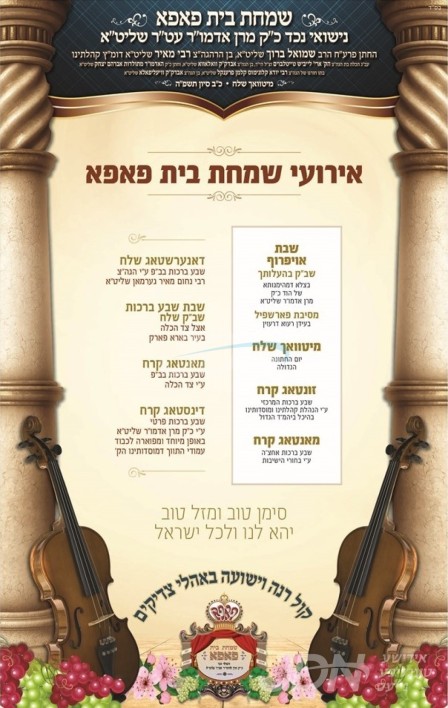 שמחת בית פאפא: היינט קומט פאר די שמחת השבע ברכות פון א אייניקל ביי כ"ק אדמו"ר מפאפא שליט"א, די חתן א זון פון בנו הגדול הגה"צ ר' מאיר גרינוואלד שליט"א דומ"ץ פאפא, איידעם ביי הגה"צ ר' לייבוש טויב זצ"ל מקאלוב. מיט די כלה א טאכטער פון הגה"צ ר' לייבוש טייטלבוים זצ"ל הי"ד, זון פון הגה"צ אבד"ק וואלאווע שליט"א, און איידעם ביי כ"ק אדמו"ר מתולדות אברהם יצחק שליט"א. – די שמחת השבע ברכות קומט פאר דורך די תלמידי הישיבות דחסידי פאפא.