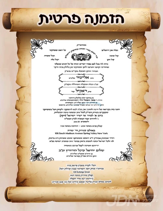 היינט קומט פאר די שמחת החתונה פונעם חתן א זון פון הרב שלום יחיאל מיכל הורוויץ שליט"א, זון פון כ"ק אדמו"ר ממעליץ ב"פ שליט"א, און איידעם ביי הגה"צ אבד"ק קאראד שליט"א, מיט די כלה א טאכטער פון הרב משה שמואל ראטטענבערג שליט"א, זון פון הגה"צ אבד"ק קאזעווע שליט"א, און איידעם ביי הגה"צ ר' מנחם מענדיל פאנעט שליט"א מדעעש. – די שמחת החתונה קומט פאר אין זאל עטרת חי' שרה אין מאנסי.