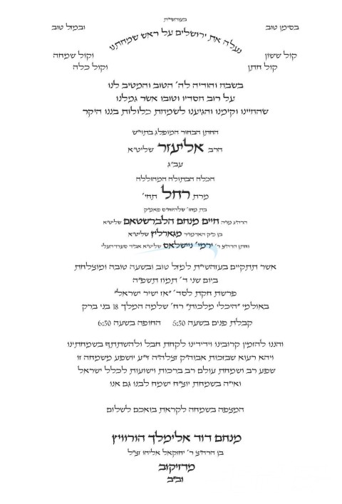 היינט קומט פאר די שמחת החתונה פונעם חתן א זון פון הרב יוסף הערש פאנעט שליט"א, זון פון כ"ק אדמו"ר מקארלסבורג מאנטריאל שליט"א, און איידעם ביי הגה"צ אבד"ק וואדקערט סעמיהאלי זצ"ל, מיט די כלה א טאכטער פון הרב משה הערש מיכלאוויטש שליט"א, זון פון כ"ק אדמו"ר מזלאטשוב נתני' שליט"א. – די שמחת החתונה קומט פאר אין בית רחל זאל אין אנטווערפן.