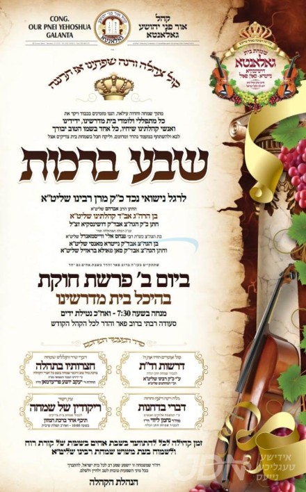 היינט קומט פאר די שמחת השבע ברכות פונעם חתן א זון פון הגה"צ ר' שלמה יעקב זיידא אייכענשטיין שליט"א אב"ד גאלאנטא, זון פון כ"ק אדמו"ר מגאלאנטא שליט"א, און איידעם ביי הגה"צ אבד"ק דושינסקיא וומס"ב זצ"ל, מיט די כלה א טאכטער פון הגה"צ ר' פנחס אלי' ווייסמאנדל שליט"א, זון פון הגה"צ אבד"ק נייטרא מאנסי שליט"א, און איידעם ביי הגה"צ ר' מאיר אברהם איליאוויטש שליט"א גאב"ד קהילות החרדית אין ס. פאולא בראזיל. – די שמחת השבע ברכות קומט פאר אין גאלאנטא בית המדרש אין וויליאמסבורג.