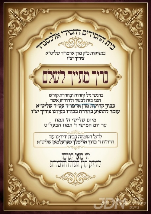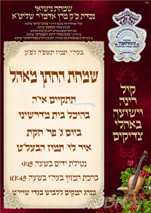 היינט קומט פאר די שמחת החתן מאהל פונעם חתן א זון פון הגה"צ ר' מנחם מענדיל יהושע לעמבערגער שליט"א, זון פון הגה"צ אבד"ק מאקאווא ב"ב זצ"ל, און איידעם ביי הגה"צ אבד"ק סערדאהעלי ב"ב שליט"א, מיט די כלה א טאכטער פון הגה"צ ר' פנחס ישראל טווערסקי שליט"א, זון פון כ"ק אדמו"ר מטשארנאביל שליט"א, און איידעם ביי כ"ק אדמו"ר מקאסאן הילקרעסט שליט"א. – די שמחת החתן מאהל קומט פאר אין ביהמ"ד טשארנאביל אין אשדוד.