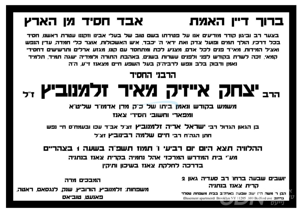 אלפי חסידי צאנז נעמען אויף די שווערע בשורה איבער די פטירה פונעם לאנגיעריגן משמש בקודש, הרב החסיד ר' אייזיק מאיר זאלמענאוויטש ז"ל, וועלכער איז יעצט ביינאכט אין ארץ ישראל נפטר געווארן אין עלטער פון צוויי און זיבעציג יאר, נאך א שווערע קראנקהייט מיט וואס ער האט זיך געמוטשעט די לעצטע פאר יאר ל"ע.