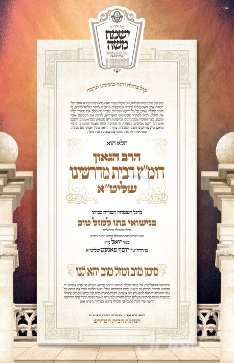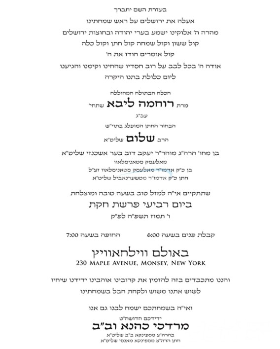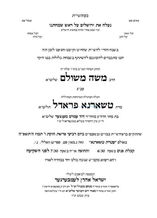 היינט קומט פאר די שמחת החתונה פונעם חתן א זון פון הגה"צ ר' יוסף פאנעט שליט"א, זון פון כ"ק אדמו"ר מדעעש ב"פ שליט"א, און איידעם ביי כ"ק אדמו"ר מטשערקאס שליט"א, מיט די כלה א טאכטער פון הגה"צ ר' בערל ראזענבערגער שליט"א דומ"ץ ביהמ"ד ישמח משה אין קרית יואל, זון פון הגה"צ ר' נתן דוד ראזענבערגער שליט"א אבד"ק גמזו ודומ"ץ התאחדות הרבנים. – די שמחת החתונה קומט פאר אין זאל עטרת מייזעלס אין קרית יואל.