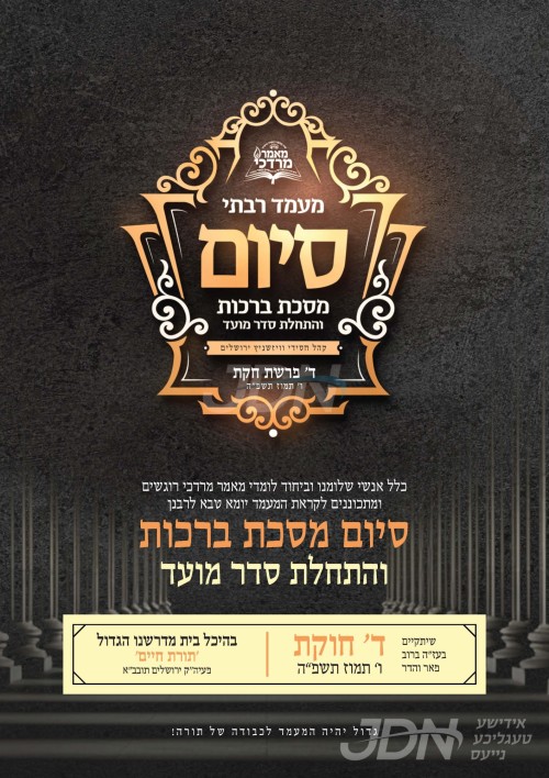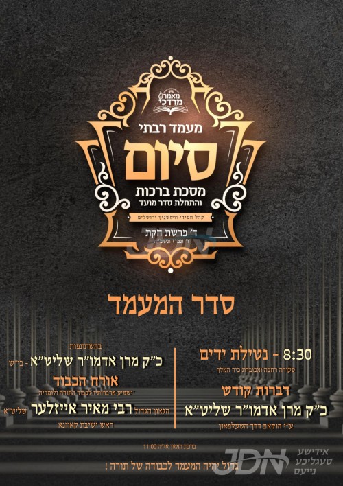 היינט קומט פאר די מעמד סיום מסכת ברכות והתחלת סדר מועד במסגרת הלימוד מאמר מרדכי דחסידי וויזניץ, אין ביהמ"ד הגדול וויזניץ אין ירושלים, אין שפיץ פון כ"ק אדמו"ר מוויזניץ שליט"א פון בית שמש. כ"ק אדמו"ר מוויזניץ שליט"א פון ירושלים וועט משמיע זיין דברות קודש דורך א לייוו הוקאפ.