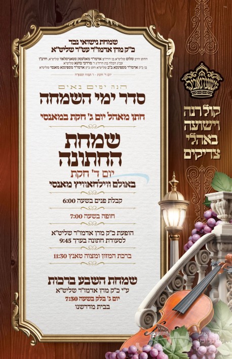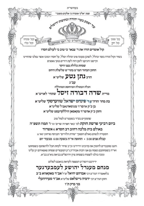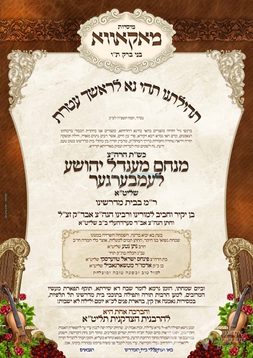 שמחת בית טשארנאביל – קאסאן: היינט קומט פאר די שמחת החתונה פונעם חתן א זון פון הגה"צ ר' מנחם מענדיל יהושע לעמבערגער שליט"א, זון פון הגה"צ אבד"ק מאקאווא ב"ב זצ"ל, און איידעם ביי הגה"צ אבד"ק סערדאהעלי ב"ב שליט"א, מיט די כלה א טאכטער פון הגה"צ ר' פנחס ישראל טווערסקי שליט"א, זון פון כ"ק אדמו"ר מטשארנאביל שליט"א, און איידעם ביי כ"ק אדמו"ר מקאסאן הילקרעסט שליט"א. – די שמחת החתונה קומט פאר אין זאל בית מלכה אין אשדוד.