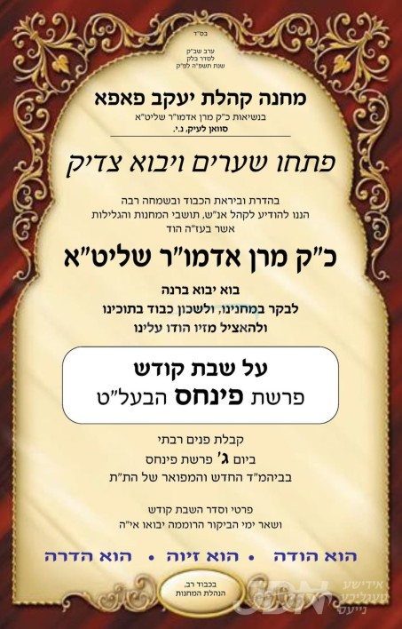 היינט קומט פאר א מעמד קבלת פנים לכבודו פון כ"ק אדמו"ר מפאפא שליט"א, וועלכער קומט אן אויף די יערליכע באזוך אין מחנה קהלת יעקב פאפא אין סוואן לעיק, די מעמד קומט פאר אינעם גרויסן בית המדרש אין קעמפ.