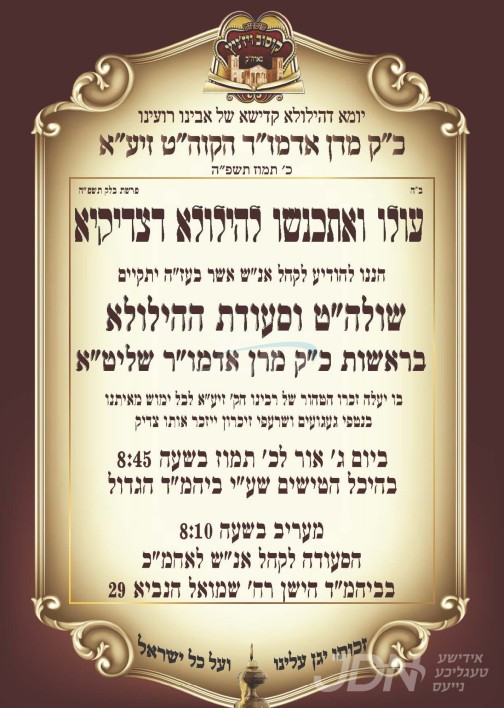 חתנו כ"ק אדמו"ר מקוסוב וויזניץ שליט"א וועט אפרעכטן די יארצייט טיש היינט נאכט בבית מדרשו אין בית שמש.