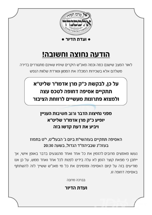 היינט קומט פאר א ספעציעלע אסיפה אין ק"ק אלכסנדר אין בני ברק, ארויסצוהעלפן די אינגעלייט מיט אייגענע דירות מיט הרחבת הדעת, די מעמד קומט פאר אינעם עזרת נשים אין אלכסנדר בית המדרש אויף רחוב אחיעזר, אין שפיץ פון כ"ק אדמו"ר מאלכסנדר שליט"א.