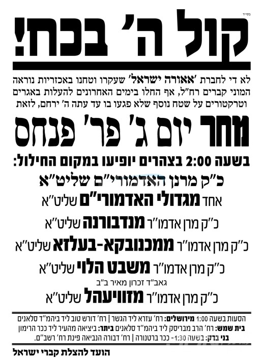 היינט קומט פאר פרישע מחאות אדירות אויפן שטח בית החיים אין יהוד, וואו עס קומט ליידער פאר חיטוטי שכבי רח"ל, די מחאות היינט וועט פארקומען אין שפיץ פון כ"ק האדמורי"ם מנדבורנא, מאחנובקא בעלזא, שבט הלוי, און זוועהיל שליט"א.
