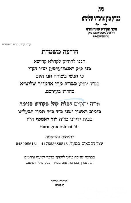 כ"ק אדמו"ר מסאדיגורא שליט"א וועלכער איז צוגאסט די טעג אין אנטווערפן, וועט אין לויף פון היינט און מארגן געזעגענען דעם ציבור חסידים תושבי העיר, אין שטוב פון הרב דוד קאמפף הי"ו.