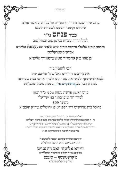 היינט קומט פאר די שמחת הבר מצוה פון א אייניקל ביי כ"ק אדמו"ר מקרעטשניף סיגעט שליט"א, א זון פון זיין איידעם הגה"צ ר' חיים מאיר שנעעבאלג שליט"א אב"ד סטרעליסק, זון פון כ"ק אדמו"ר מטשערנאוויץ שליט"א. – די שמחה קומט פאר אין ביהמ"ד קרעטשניף סיגעט אויף רחוב רפפורט אין ירושלים.