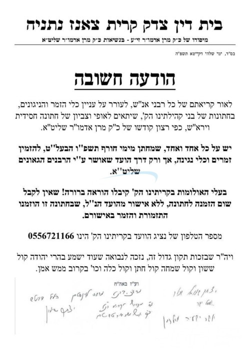 א אייגענארטיגע בריוו ערשיינט היינט דורך די בית דין צדק אין קרית צאנז נתניה, וואו די רבני הקהילה אין חצר הקודש צאנז אפעלירן צום ציבור חסידים אויסצופאלגן די הוראות אנבאלאנגט חסידישע נגינה ביי שמחות, מיטן אוועקשטעלן א נייע תקנה וואס פארלאנגט אלע בעלי שמחה צו באשטעלן בלויז ערליכע בעלי מנגנים, וואס זענען מאושר דורך די ספעציעלע וועד וואס גיבט זיך אפ דערמיט.