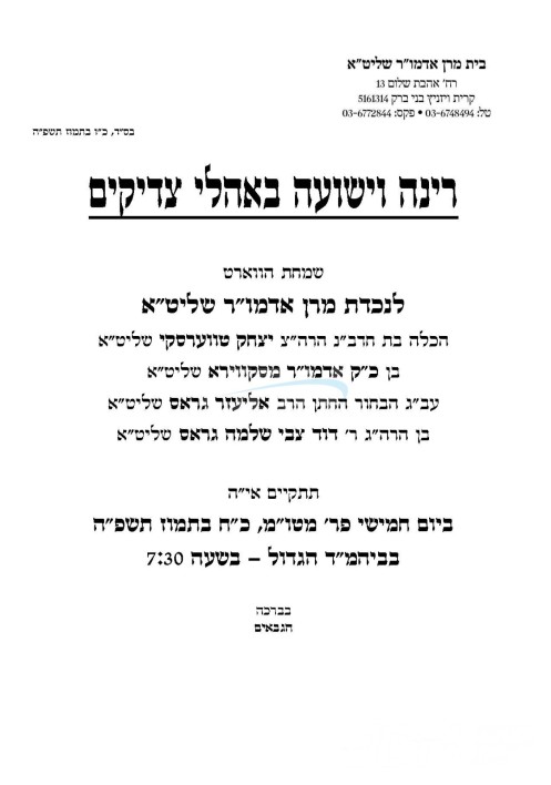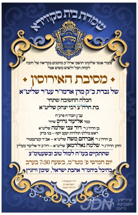שמחת בית וויזניץ - סקווירא: היינט קומט פאר די שמחת הווארט פון די כלה יונגסטע קינד ביי הגה"צ ר' יצחק טווערסקי שליט"א, זון פון כ"ק אדמו"ר מסקווירא שליט"א, און איידעם ביי כ"ק אדמו"ר מוויזניץ שליט"א, מיט די חתן א זון פון הרב דוד גראס שליט"א ראה"כ סקווירא בני ברק, זון פון הגה"צ ר' אברהם משה גראס שליט"א אבד"ק קערעסטיר בערבעשט און דיין אין שיכון סקווירא, איידעם ביי כ"ק אדמו"ר מלעלוב זצ"ל, און איידעם ביי הגה"צ ר' שלמה גאלדמאן שליט"א, זון פון הגה"צ ר' שמואל גאלדמאן שליט"א מזוועהיל פון שיכון סקווירא. – די שמחה קומט פאר אין ביהמ"ד הגדול אין קרית וויזניץ בני ברק.