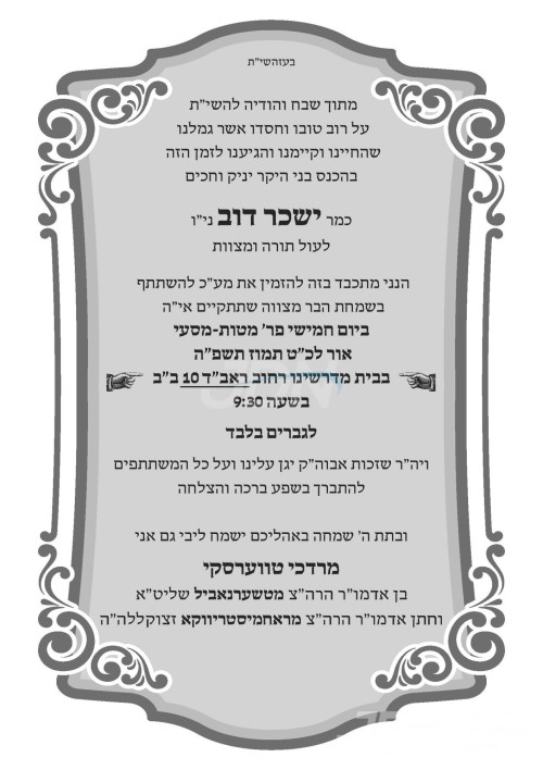 היינט קומט פאר די שמחת הבר מצוה פון א אייניקל ביי כ"ק אדמו"ר מטשערנאביל שליט"א, הבחור הבר מצוה ישכר דוב נ"י זון פונעם רבינ'ס עלטסטע זון הגה"צ ר' מרדכי טווערסקי שליט"א, איידעם ביי כ"ק אדמו"ר מראחמיסטריווקא זצ"ל. – די שמחה קומט פאר אין ביהמ"ד טשערנאביל אויף רחוב ראב"ד אין בני ברק.