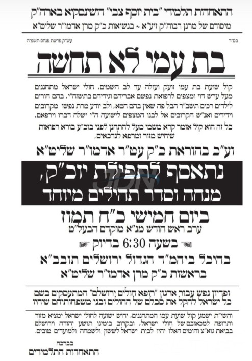 היינט קומט פאר א גרויסע עצרת תפילה אין ביהמ"ד הגדול דושינסקיא אין ירושלים, לעורר רחמים למען חולי ישראל, אינעם יום המסוגל פון ערב ראש חודש מוקדם, עס קומט פאר אין שפיץ פון כ"ק אדמו"ר מדושינסקיא שליט"א.