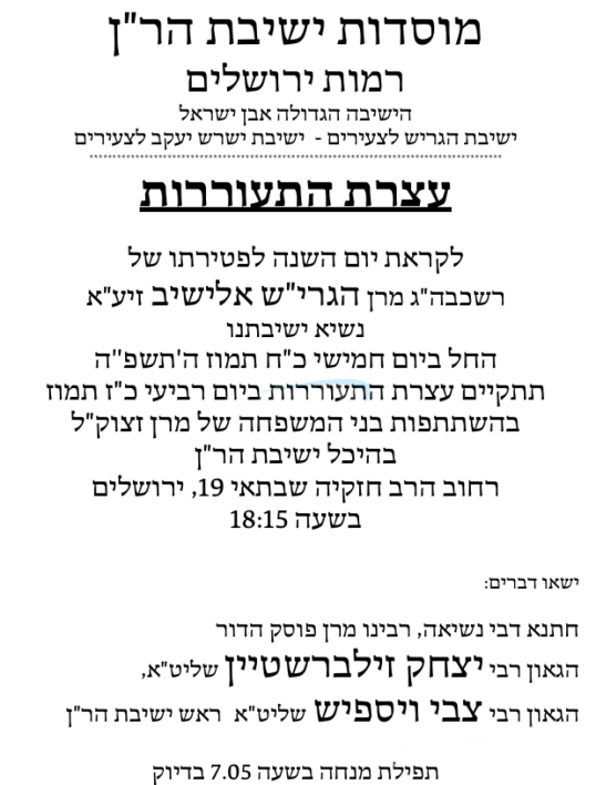 היינט כ"ח תמוז געפאלט די דרייצנטע יארצייט פונעם פוסק הדור מרן הגאון הגדול רבי יוסף שלום אלישיב זצ"ל, א גרויסע עצרת התעוררות לזכרו קומט פאר אין היכל ישיבת הר"ן אין ירושלים, וואו עס וועט אויפטרעטן חתנו הגאון הגדול רבי יצחק זילבערשטיין שליט"א.