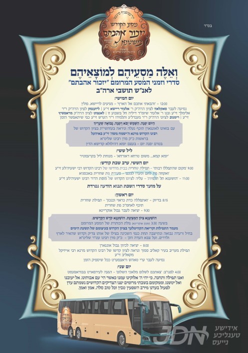 כ"ק אדמו"ר מסערעדנא שליט"א לאזט זיך היינט ארויס אויף א נסיעה קיין אייראפע, צו פוקד זיין די קברי צדיקים אין פוילין, אוקראינע, און אונגארן, לקראת די שמחת החתונה פונעם עלטסטן אייניקל וואס קומט פאר קומענדיגע חודש.