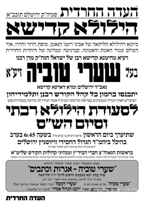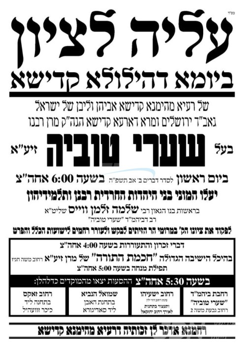 היינט ב' אב געפאלט די דריטע הילולא קדישא פון כ"ק הגה"ק רבי יצחק טובי' ווייס זצ"ל גאב"ד ירושלים עיה"ק בעל שערי טוביה, די מעמד עלי' לציון קומט פאר זעקס אזייגער נאכמיטאג אויפן הר הזיתים, אין שפיץ פון בנו יחידו הרה"ג ר' שלמה זלמן ווייס שליט"א רב ביהמ"ד שערי טוביה.