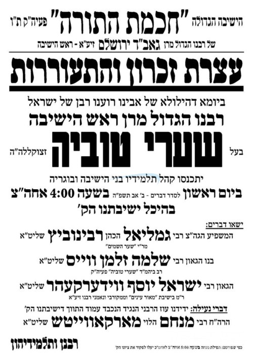 א גרויסע עצרת זכרון והתעוררות קומט פאר אין היכל ישיבת חכמת התורה אין ירושלים, אין שפיץ פון הרבנים הגאונים שליט"א.