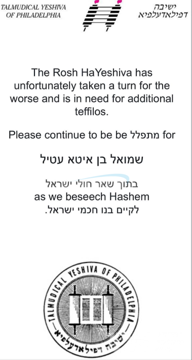 כלל ישראל טוט מתפלל זיין און מעורר זיין רחמי שמים לרפואתו השלימה והמהירה, מרן הגאון הגדול רבי שמואל בן איטא עטל לרפואה שלימה, בתוך שאר חולי ישראל, דער ראש ישיבה זאל נאך פארבלייבן מיט אונז און משפיע זיין אויף אונזער דור מזיו תורתו, עוד ינוב בשיבה דשנים ורעננים.