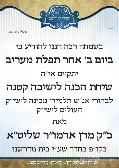 היינט קומט פאר די שמחת הבר מצוה פון א זון ביי הרב הלל מרדכי אליעזר האלבערשטאם שליט"א, זון פון הגה"צ ר' יעקב דוד האלבערשטאם שליט"א אבד"ק צאנז טשאקאווא ודומ"ץ בעדה החרדית, און איידעם ביי הגה"צ ר' יהושע ליבערמאן שליט"א ראש ישיבת שומרי החומות. – די שמחה קומט פאר אין זאל פון ביהמ"ד דרך החיים אין שטאט אלעד.