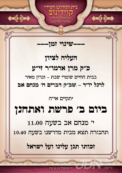 כ"ק אדמו"ר מקוידינוב שליט"א וועט היינט ארויפגיין צום ציון הק' פונעם זיידן כ"ק אדמו"ר מקוידינוב זצ"ל אויפן בית החיים זכרון מאיר שומרי שבת אין בני ברק, לרגל די הילולא קדישא וואס איז אויסגעפאלן דעם שבת קודש ח' אב. שפעטער אויפדערנאכט וועט דער רבי שליט"א אויפטרעטן מיט א שמועס פאר די בחורי החסידות וואס גרייטן זיך אריינצוגיין אין ישיבה צום קומענדיגן זמן הלימודים.
