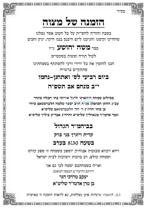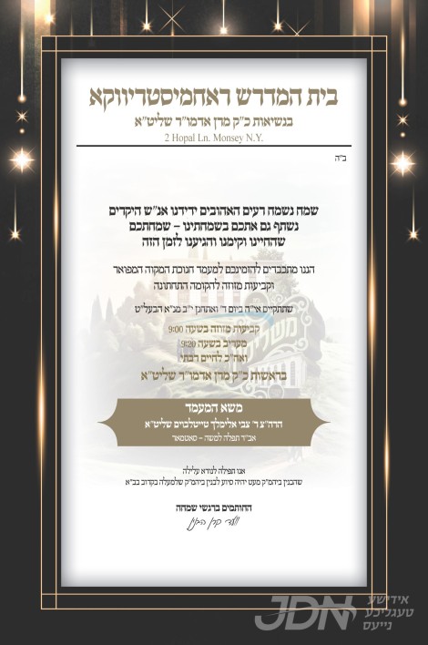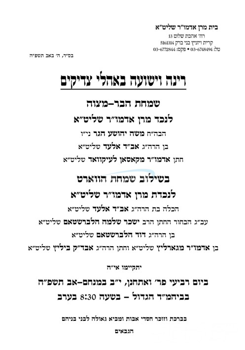 שמחת בית וויזניץ: היינט קומט פאר א דאפלטע שמחה בחצר הקודש וויזניץ, שמחת הבר מצוה פון א זון ביי הגה"צ ר' יעקב מרדכי האגער שליט"א אב"ד וויזניץ אלעד, זון פון כ"ק אדמו"ר מוויזניץ שליט"א, און איידעם ביי כ"ק אדמו"ר מקאסאן לעיקוואד שליט"א, און די שמחת הווארט פון די כלה א טאכטער ביי הגה"צ ר' יעקב מרדכי האגער שליט"א אב"ד וויזניץ אלעד, מיט די חתן א זון פון הגה"צ ר' דוד האלבערשטאם שליט"א, זון פון כ"ק אדמו"ר מגארליץ שליט"א, און איידעם ביי הגה"צ ר' פנחס שטערן שליט"א אבד"ק ביליץ ב"ב. – די שמחה קומט פאר אין ביהמ"ד הגדול אין קרית וויזניץ בני ברק.