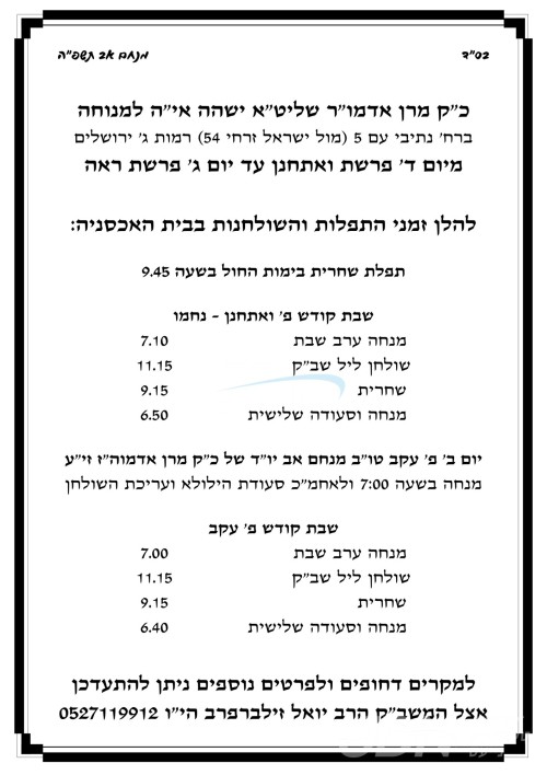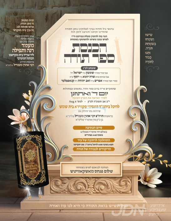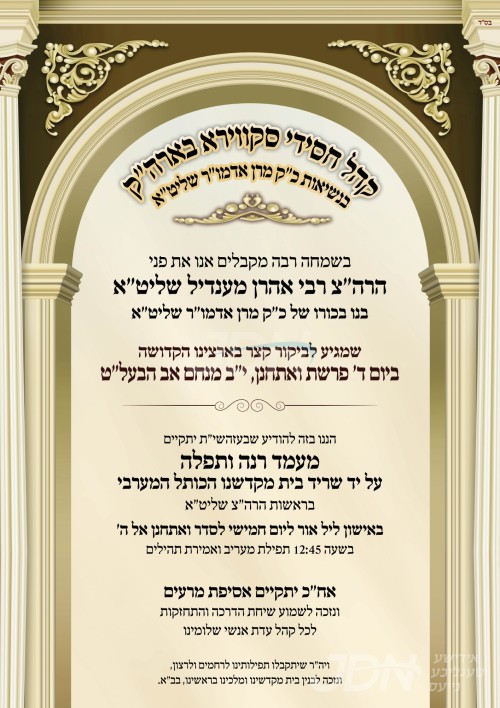 היינט קומט פאר די מעמד הכנסת ספר תורה וואס ווערט אריינגעגעבן צום סקווירא בית המדרש אין בית שמש, נדבת הרב החסיד ר' שלום פנחס מאשקאוויטש הי"ו, עס קומט פאר אין שפיץ פון הגה"צ ר' אהרן מענדיל טווערסקי שליט"א בנו הגדול פון כ"ק אדמו"ר מסקווירא שליט"א וועלכער איז ספעציעל אנגעקומען צוגאסט קיין ארץ ישראל לכבוד די מעמד, אזוי אויך וועט ער היינט באשיינען די מעמד קביעת מזוזה און חנוכת הבית פאר די נייע חסד שטוב אין די זיו שפיטאל אין צפת, און שפעטער ביינאכט אנקומען אויף א תפילת רבים צום שריד בית מקדשינו דער כותל המערבי.