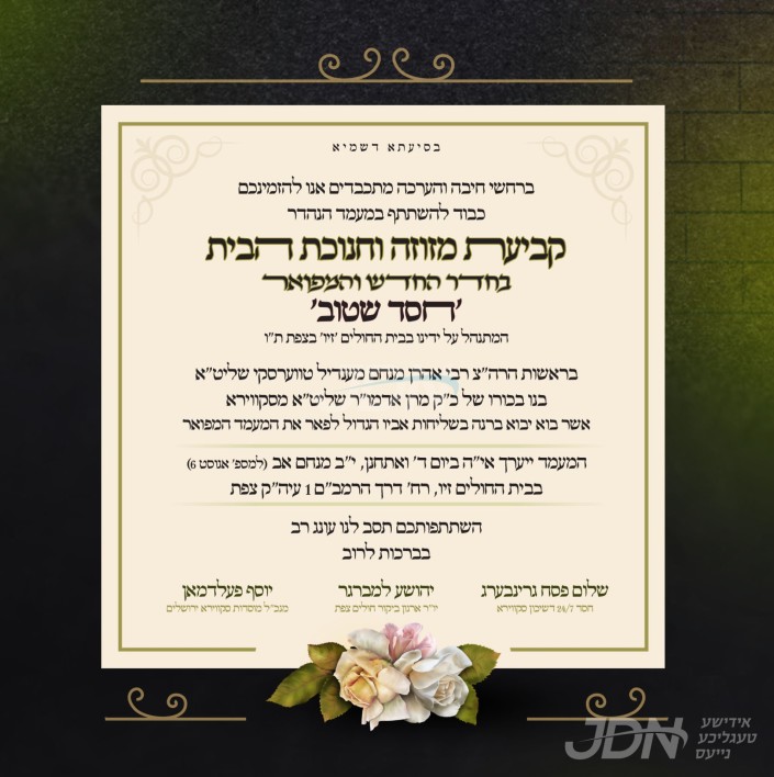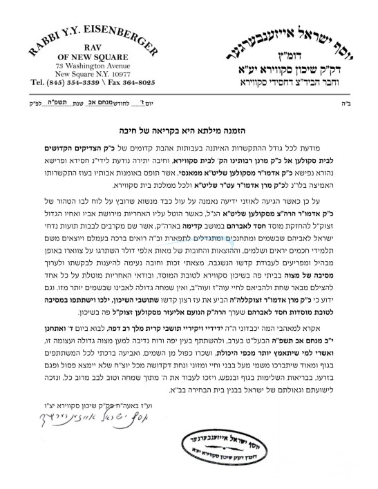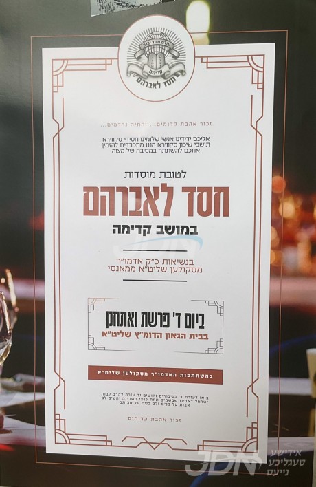 היינט קומט פאר א מסיבה לטובת מוסדות חסד לאברהם אין מושב קדימה אין ארץ ישראל, אין שטוב פון הגה"צ ר' יוסף ישראל אייזענבערגער שליט"א דומ"ץ שיכון סקווירא, אין שפיץ פונעם נשיא המוסדות כ"ק אדמו"ר מסקולען שליט"א פון מאנסי.