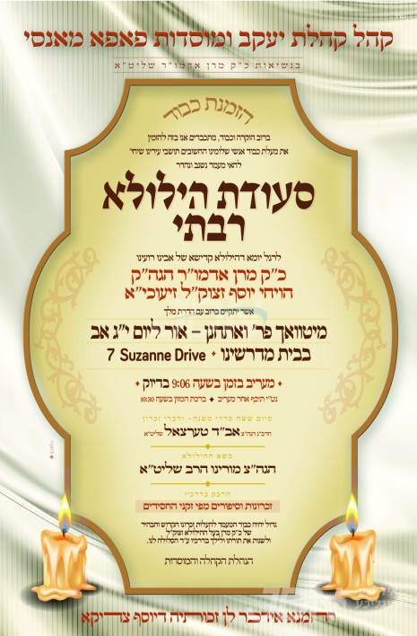 היינט נאכט י"ג אב געפאלט די יומא דהילולא קדישא פון כ"ק אדמו"ר הרה"ק בעל ויחי יוסף מפאפא זי"ע, בנו ממלא מקומו כ"ק אדמו"ר מפאפא שליט"א וועט אריינקומען היינט נאכט אויף תפילת מעריב אין ביהמ"ד הגדול אין קרית פאפא וועסטשעסטער, און דערנאך אפרעכטן א לחיים טיש און סיום משניות. אין אלע בתי מדרשים דחסידי פאפא איבער די וועלט וועלן פארקומען יארצייט סעודות ברוב עם.