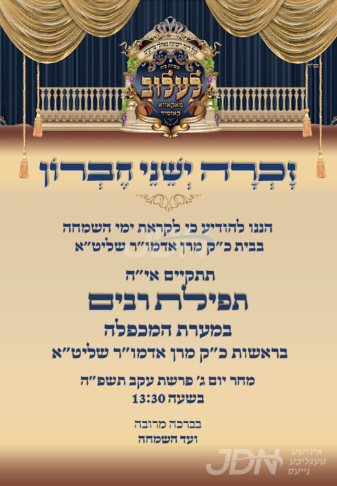 שמחת בית סקווירא: היינט קומט פאר די שמחת החתן מאהל פון א אור אייניקל ביי כ"ק אדמו"ר מסקווירא שליט"א, אייניקל פון זיין איידעם כ"ק אדמו"ר מראחמיסטריווקא שליט"א פון מאנסי, די כלה א טאכטער פון זיין איידעם הרב צבי אלימלך טווערסקי שליט"א, אייניקל פון אדמור"י בית לויעוו טשערנאביל זי"ע, מיט די חתן א זון פון הרב שמעון דוב טווערסקי שליט"א, זון פון כ"ק אדמו"ר מלויעוו טשערנאביל פארשעי שליט"א, און איידעם ביי הגה"צ אבד"ק מאקאווא ב"פ זצ"ל. – די שמחת החתן מאהל קומט פאר אין ביהמ"ד הגדול אין שיכון סקווירא.