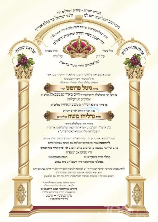 היינט קומט פאר די שמחת החתונה פונעם חתן א זון פון כ"ק אדמו"ר מספינקא גני גד שליט"א, אייניקל פון כ"ק אדמו"ר מגארליץ זצ"ל, מיט די כלה א טאכטער פון הרב נתן נטע פאנעט שליט"א, זון פון הגה"צ ר' אהרן דוד פאנעט זצ"ל ראה"כ זיבענבערגן, און איידעם ביי הגה"צ ר' צמח דוד ראבינאוויטש שליט"א אדמו"ר מביאלא פשיסחא ישרי לב. – די שמחת החתונה קומט פאר אין זאל היכלי מלכות אין בני ברק.