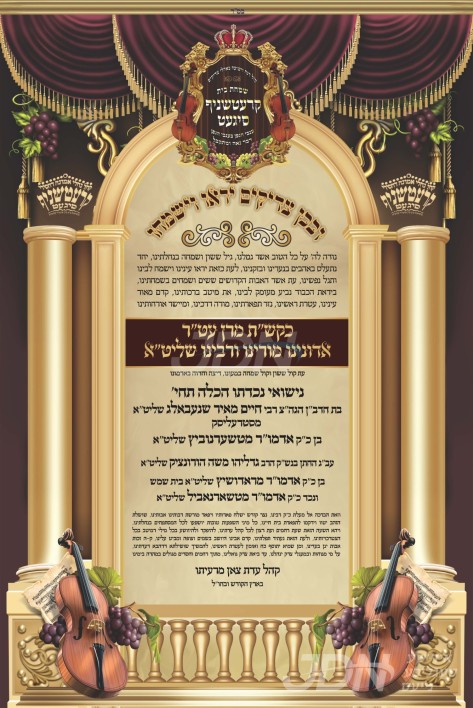 שמחת בית קרעטשניף סיגעט – טשארנאביל – טשערנאוויץ: היינט קומט פאר די שמחת החתונה פונעם חתן א זון פון הגה"צ ר' ישראל האראנטשיק שליט"א אדמו"ר מראדאשיץ רמה ד' בית שמש, איידעם ביי כ"ק אדמו"ר מטשארנאביל שליט"א, מיט די כלה א טאכטער פון הגה"צ ר' חיים מאיר שנעעבאלג שליט"א אבד"ק סטרעליסק, זון פון כ"ק אדמו"ר מטשערנאוויץ שליט"א, און איידעם ביי כ"ק אדמו"ר מקרעטשניף סיגעט שליט"א. – די שמחת החתונה קומט פאר אין פארהאנד זאל אין בית שמש.