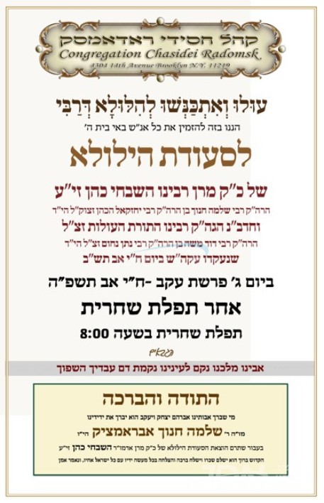 לרגל די יארצייט פון הרה"ק בעל שבחי כהן מראדאמסק זי"ע און זיין איידעם הרה"ק בעל תורת העולות זי"ע, וועט היינט צופרי פארקומען א סעודת הילולא אין ביהמ"ד ראדאמסק אין בארא פארק.