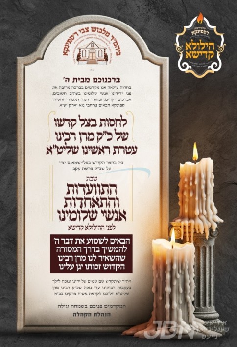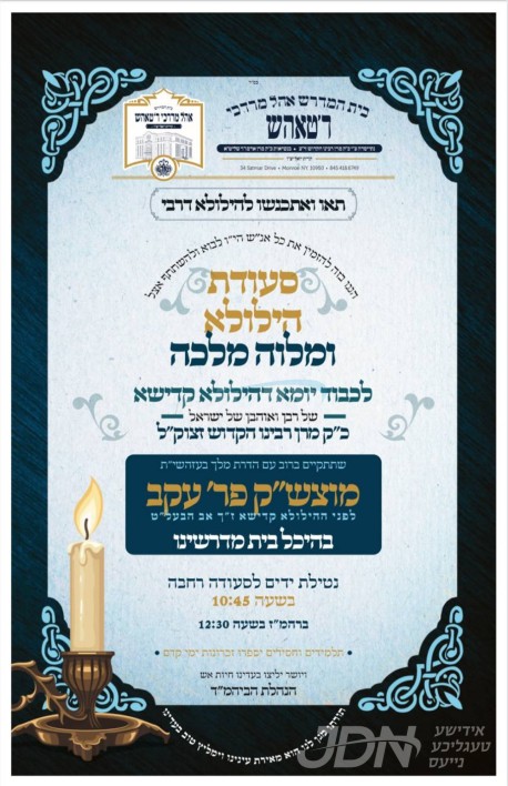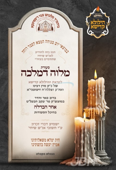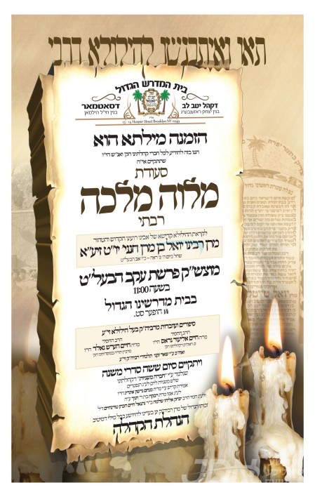 דעם מוצאי שבת וועט פארקומען איבער די וועלט פילצאליגע מסיבות מרעימ'ס און מלוה מלכה'ס לקראת די גרויסע יארצייטן וואס געפאלט אויס די וואך, הרה"ק מסאטמאר זי"ע, הרה"ק מספינקא זי"ע, הרה"ק מטאהש זי"ע, הרה"ק בעל נועם אליעזר מסקולען זי"ע, און הרה"ק מראחמיסטריווקא זי"ע.