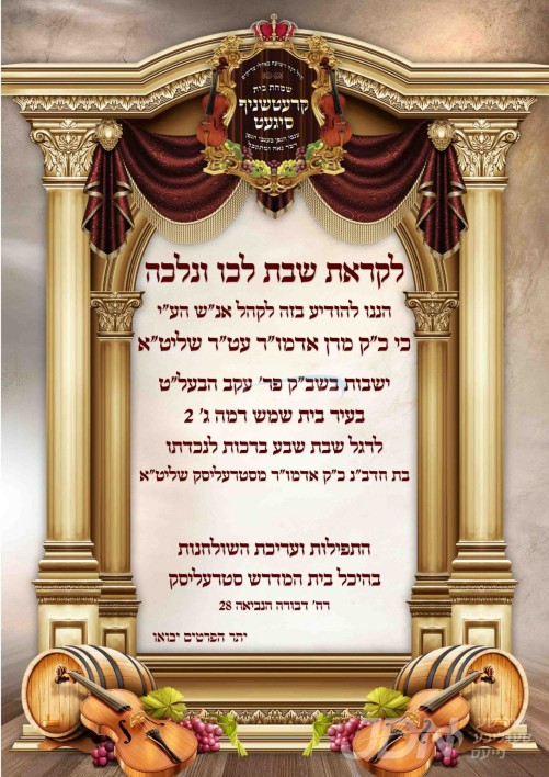 שמחת בית קרעטשניף סיגעט – טשארנאביל – טשערנאוויץ: דעם שבת קומט פאר די שמחת השבע ברכות פונעם חתן א זון פון הגה"צ ר' ישראל האראנטשיק שליט"א אדמו"ר מראדאשיץ רמה ד' בית שמש, איידעם ביי כ"ק אדמו"ר מטשארנאביל שליט"א, מיט די כלה א טאכטער פון הגה"צ ר' חיים מאיר שנעעבאלג שליט"א אבד"ק סטרעליסק, זון פון כ"ק אדמו"ר מטשערנאוויץ שליט"א, און איידעם ביי כ"ק אדמו"ר מקרעטשניף סיגעט שליט"א. – די שמחת השבע ברכות קומט פאר אין ביהמ"ד סטרעליסק אין בית שמש. די זיידעס כ"ק האדמורי"ם מקרעטשניף סיגעט און טשערנאוויץ שליט"א זענען צוגאסט אויף שבת אין בית שמש לכבוד די שמחה.