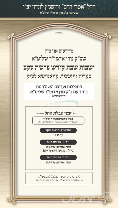 כ"ק אדמו"ר מוויזניץ שליט"א פון לאנדאן איז צוגאסט אויף דעם שבת אין קרית וויזניץ קייאמישע לעיק, די תפילות און טישן וועלן פארקומען אינאיינעם מיט אחיו הגדול כ"ק אדמו"ר מוויזניץ שליט"א פון קייאמישע, די אכסניא איז אין שטוב פון בנו הגדול הגה"צ ר' מנחם שלמה האגער שליט"א.