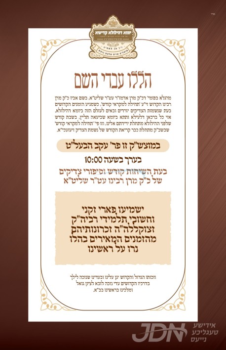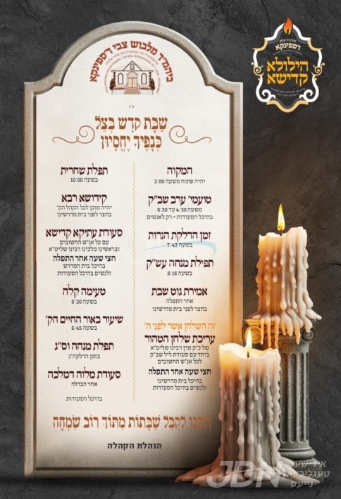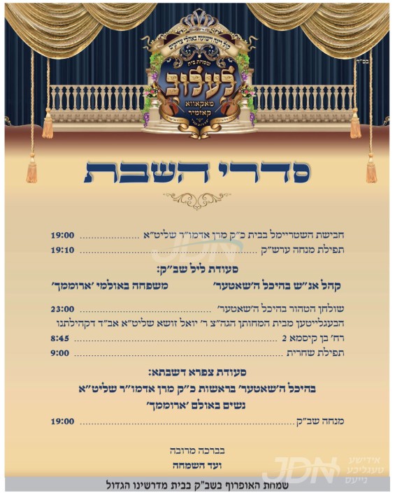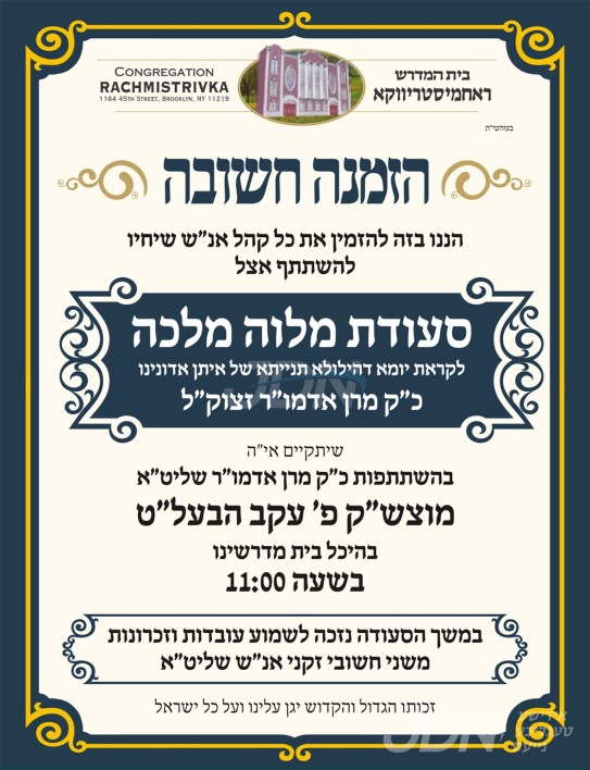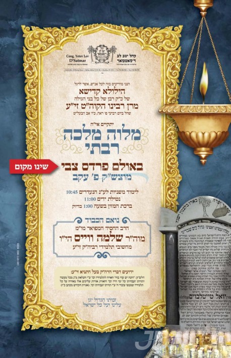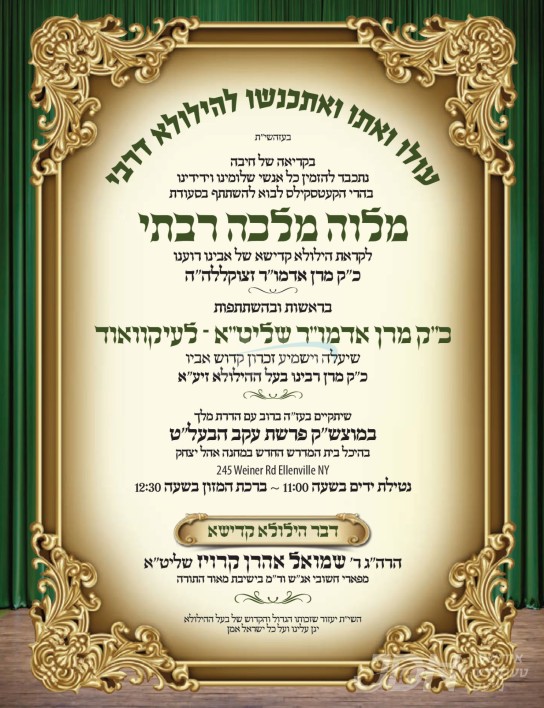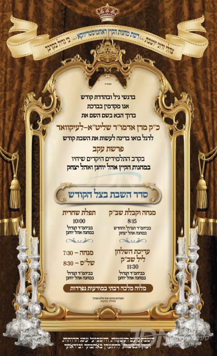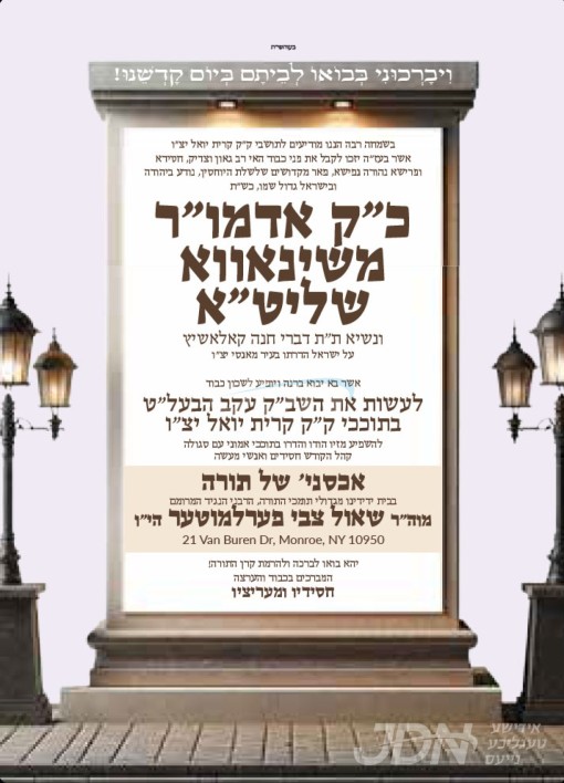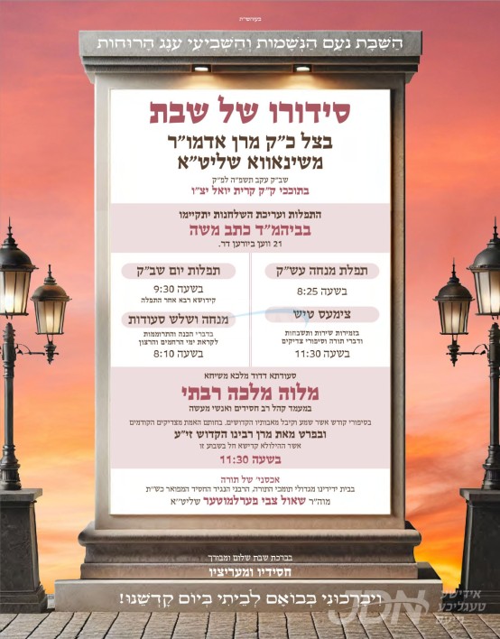 שמחת בית סקווירא: דעם שבת קומט פאר די שמחת השבע ברכות פון א אור אייניקל ביי כ"ק אדמו"ר מסקווירא שליט"א, אייניקל פון זיין איידעם כ"ק אדמו"ר מראחמיסטריווקא שליט"א פון מאנסי, די כלה א טאכטער פון זיין איידעם הרב צבי אלימלך טווערסקי שליט"א, אייניקל פון אדמור"י בית לויעוו טשערנאביל זי"ע, מיט די חתן א זון פון הרב שמעון דוב טווערסקי שליט"א, זון פון כ"ק אדמו"ר מלויעוו טשערנאביל פארשעי שליט"א, און איידעם ביי הגה"צ אבד"ק מאקאווא ב"פ זצ"ל. – די שמחת השבע ברכות קומט פאר אין ביהמ"ד הגדול אין שיכון סקווירא.
