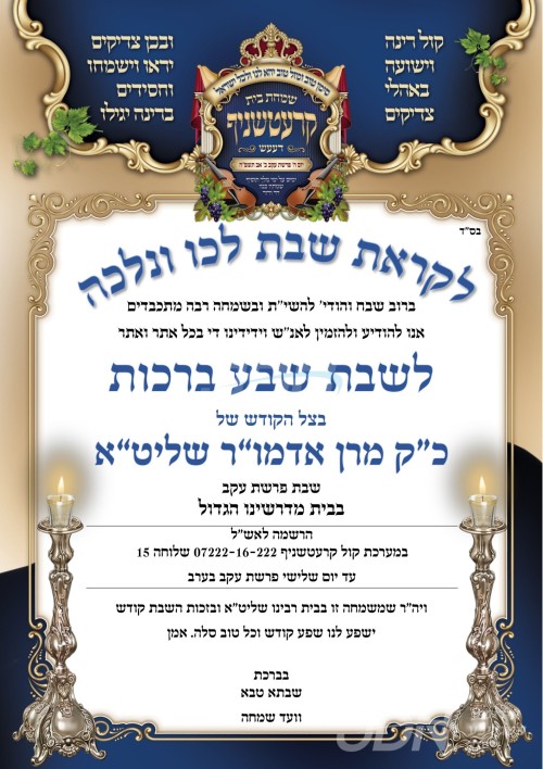 שמחת בית קרעטשניף י"ם: דעם שבת קומט פאר די שמחת השבע ברכות פון א אייניקל ביי כ"ק אדמו"ר מקרעטשניף שליט"א פון י"ם, די כלה א טאכטער פון זיין איידעם הגה"צ ר' דוד צבי הירש מייזליש שליט"א, זון פון הגה"צ ר' בעריש מייזליש שליט"א מווייטצען לאנדאן, מיט די חתן א זון פון הגה"צ ר' יעקב אלימלך פאנעט שליט"א, זון פון כ"ק אדמו"ר מדעעש זצ"ל. – די שמחת השבע ברכות קומט פאר אין ביהמ"ד הגדול קרעטשניף אויף רחוב אבינועם ילין אין ירושלים.