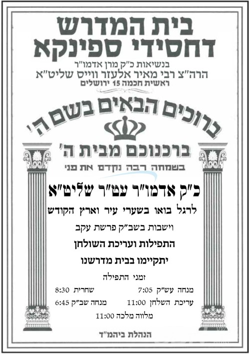 כ"ק אדמו"ר מספינקא שליט"א וועלכער איז צוגאסט אין ארץ ישראל דורכאויס די זוממער וואכן, וועט פראווענען דעם שבת בבית מדרשו אויף רחוב ראשית חכמה אין ירושלים.