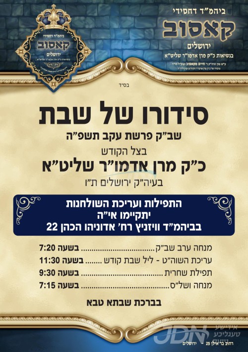 כ"ק אדמו"ר מקאסוב שליט"א וועלכער איז צוגאסט אין ארץ ישראל דורכאויס די זוממער וואכן, וועט פראווענען דעם שבת אין ביהמ"ד קהל תורת חיים וויזניץ אויף רחוב אדוניהו הכהן אין ירושלים.