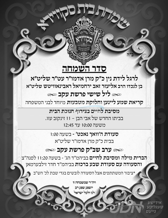 היינט קומט פאר די שמחת הברית פון א אור אייניקל ביי כ"ק אדמו"ר מסקווירא שליט"א, אייניקל פון זיין איידעם כ"ק אדמו"ר מזוועהיל ארה"ב שליט"א, בן הנולד ביי זיין איידעם הרב אליעזר זאב ראבינאוויטש שליט"א, זון פון כ"ק אדמו"ר מביאלא בני ברק שליט"א. – די שמחה קומט פאר אין ביהמ"ד הגדול אין שיכון סקווירא, און די סעודת ברית אינאיינעם מיט די שמחת השבע ברכות פון א אור אייניקל ביים רבי'ן.