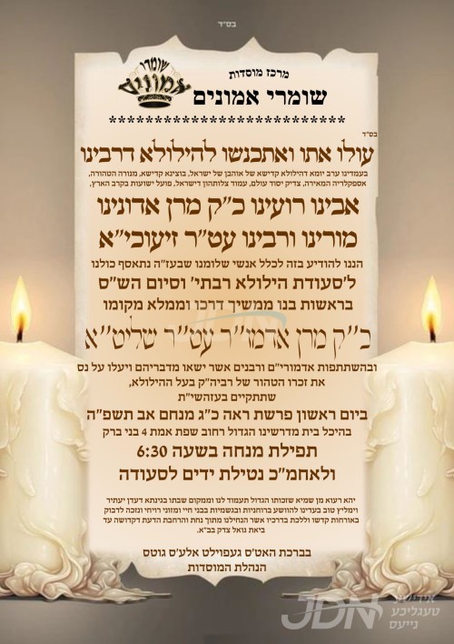 היינט קומט פאר די שמחת הבר מצוה פון די יונגסטע קינד ביי כ"ק אדמו"ר מסקולען שליט"א פון ירושלים, איידעם ביי זיין שוואגער הגה"צ ר' חיים דוב שטערן שליט"א אבד"ק סקולען ב"ב, איידעם ביי כ"ק אדמו"ר הרה"ק בעל מאור ישראל מסקולען זצ"ל. – די שמחה קומט פאר אין ביהמ"ד קאליב אויף רחוב חנה אין ירושלים.