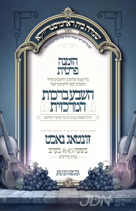 שמחת בית סקווירא - ראחמיסטריווקא: היינט קומט פאר די שמחת השבע ברכות פון א אור אייניקל ביי כ"ק אדמו"ר מסקווירא שליט"א, אייניקל פון זיין איידעם כ"ק אדמו"ר מראחמיסטריווקא שליט"א פון מאנסי, די כלה א טאכטער פון זיין איידעם הרב צבי אלימלך טווערסקי שליט"א, אייניקל פון אדמור"י בית לויעוו טשערנאביל זי"ע, מיט די חתן א זון פון הרב שמעון דוב טווערסקי שליט"א, זון פון כ"ק אדמו"ר מלויעוו טשערנאביל פארשעי שליט"א, און איידעם ביי הגה"צ אבד"ק מאקאווא ב"פ זצ"ל. – די שמחת השבע ברכות קומט פאר אין ביהמ"ד ראחמיסטריווקא אויף האופעל לעין אין מאנסי.