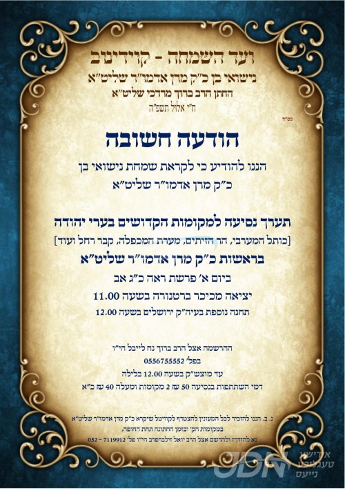 כ"ק אדמו"ר מקוידינוב שליט"א וועט היינט זונטאג ארויספארן צו די מקומות הקדושים מתפלל זיין לקראת די שמחת החתונה פון בנו החתן וואס קומט פאר דעם קומענדיגן חודש אלול, דער רבי וועט אנקומען בראש קהל חסידיו צום כותל המערבי, הר הזיתים, מערת המכפלה און קבר רחל.